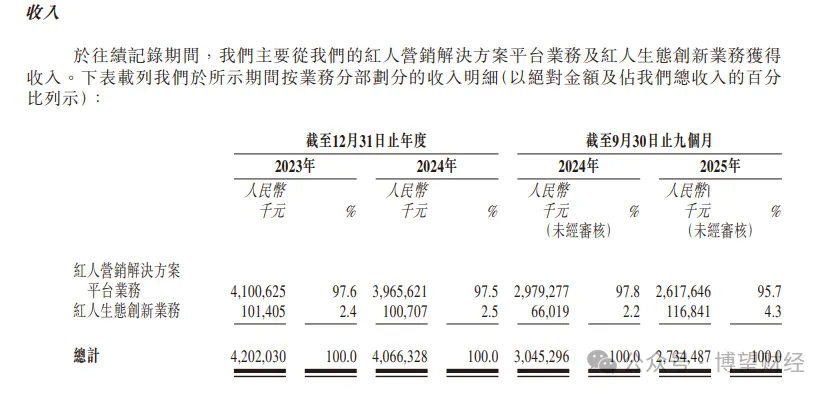 而其招股书数据显示,截至2025年9月30日,天下秀的红人营销解决方案平台业务收入占比为95.7%,红人生态创新业务收入占比为4.3%。