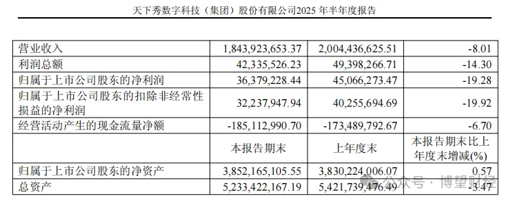 天下秀2025年半年度报告显示,其营业收入为18.44亿元,同比下降8.01%,归母净利润为0.36亿元,同比下降19.28%。