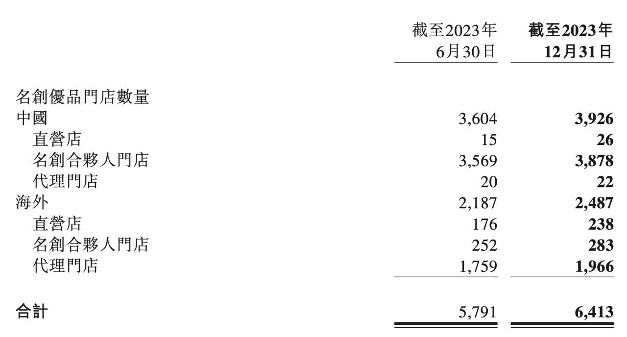 截至2023年末,名创优品全球门店数达到6413家,其中国内门店数3926家,海外门店数2487家。