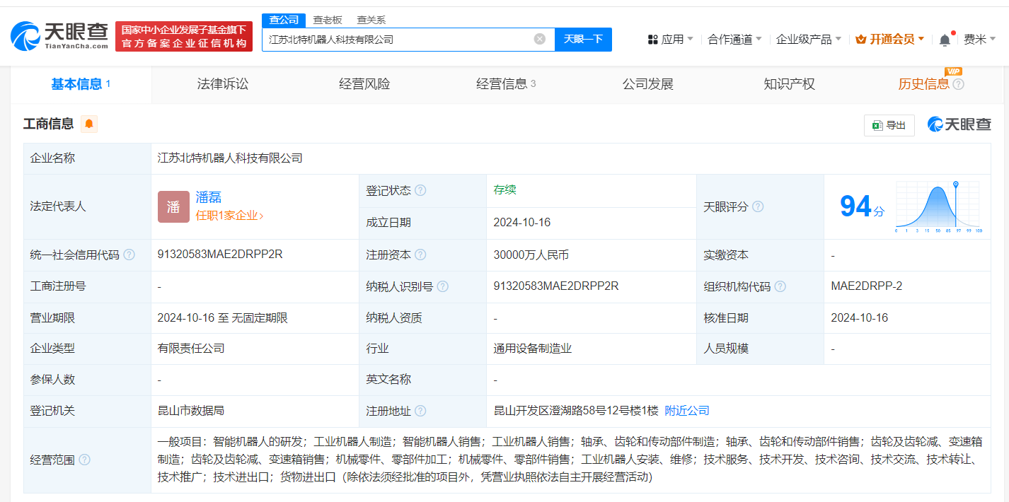 天眼查App显示,近日,江苏北特机器人科技有限公司成立,法定代表人为潘磊,注册资本3亿人民币,经营范围含智能机器人的研发、工业机器人制造、智能机器人销售、工业机器人销售、技术进出口、货物进出口等。股东信息显示,该公司由北特科技(603009)全资持股。
