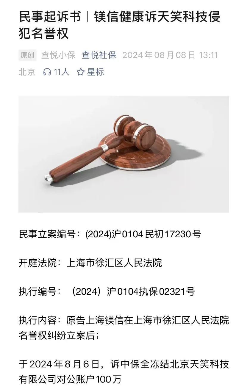 民事层面的纠纷同样持续推进。据“查悦社保”微信公众号披露的民事起诉材料显示,镁信健康已就相关言论向法院提起名誉权纠纷诉讼,并于2024年8月6日申请诉中财产保全,法院已冻结天笑科技对公账户人民币100万元。该民事案件目前也由法院正式受理,仍处于审理阶段。