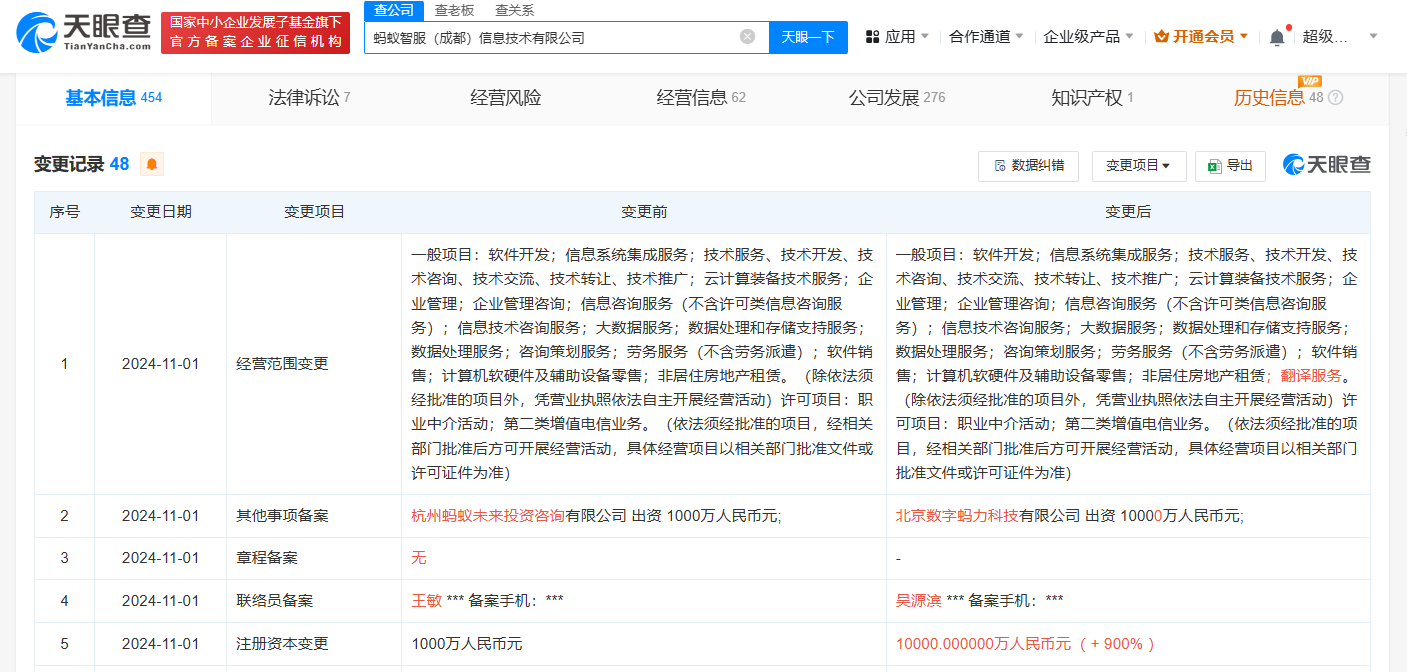 天眼查App显示,近日,蚂蚁智服(成都)信息技术有限公司发生工商变更,注册资本由1000万人民币增至1亿人民币,增幅900%。