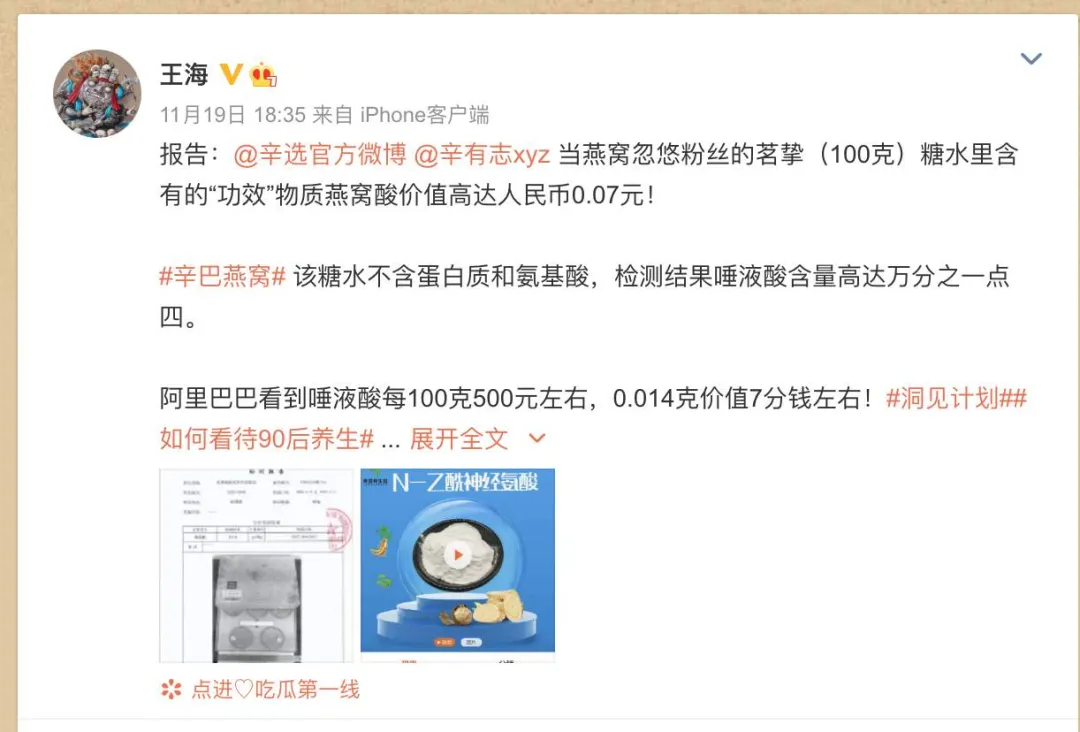 我们简单回顾一下事件始末,10月25日,该燕窝在辛巴公司辛选旗下的主播“时大漂亮”的直播间推广和售卖。在辛巴旗下主播售卖近十天后,11月4日,某dy用户自称产品消费者,在dy平台发布质疑该产品全是水、没有内容物的视频,随后此事被迅速推上抖音热点。11月6日,辛选官方微博对此事发布律师声明。11月19日,职业打假人王海发布一份检测报告,称辛选燕窝就是糖水,微博话题#辛巴所售燕窝被王海检测为糖水#登上热搜。11月20日,辛选再次发布声明称已将产品送检。11月27日,辛巴承认所售燕窝产品存在问题并提出替品牌方先行赔付方案,截至12月6日中午已向27270名消费者完成近2400万元的赔付。