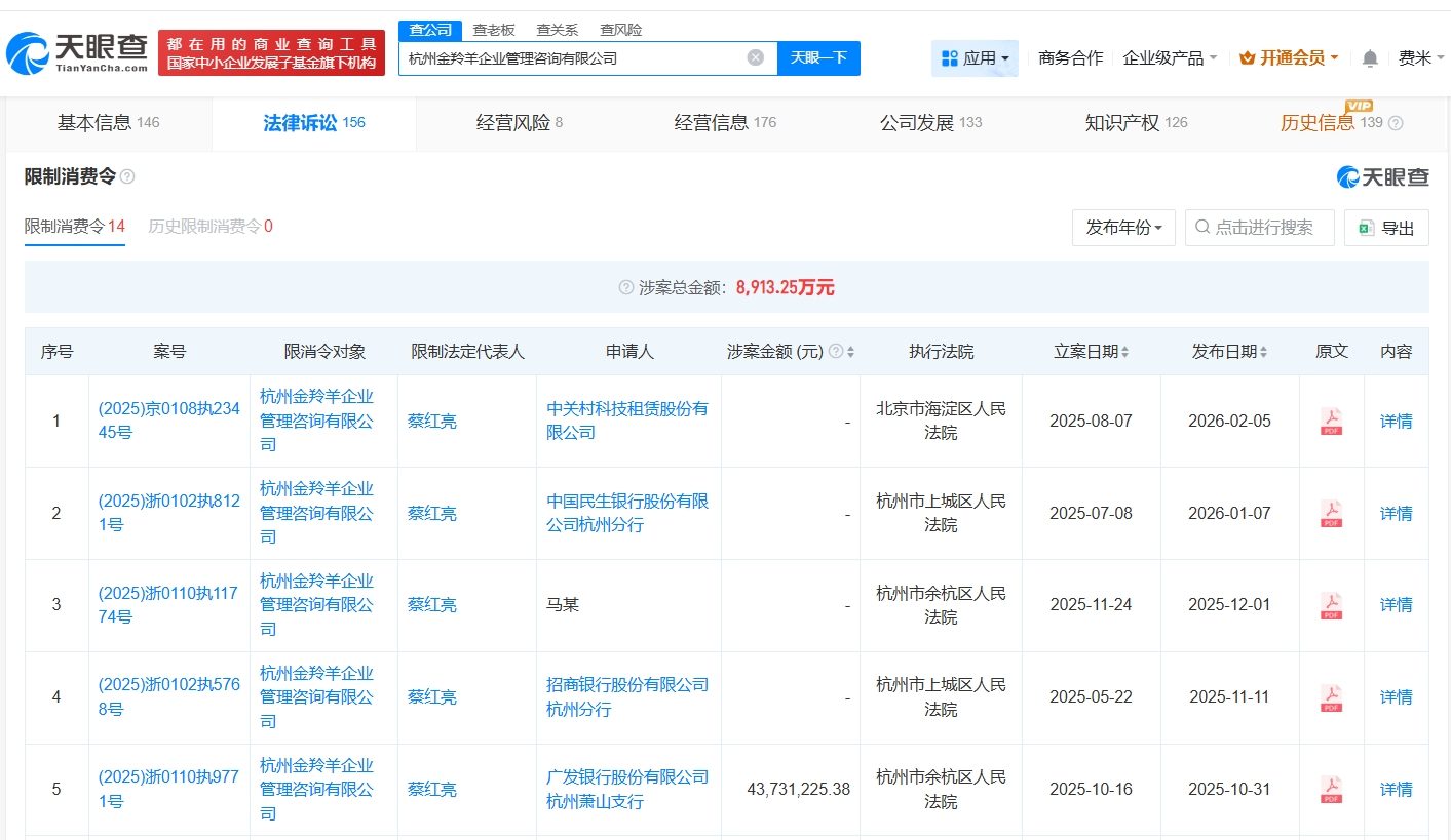 天眼查App显示,杭州金羚羊企业管理咨询有限公司成立于2018年5月,法定代表人、董事长、总经理为创始人蔡红亮,注册资本1.5亿人民币,由Panda International Investment Management Limited、蔡红亮、经新香港第五有限公司等共同持股。天眼风险信息显示,该公司现存6条被执行人信息,被执行总金额超1.4亿元,此外还存在多条股权冻结、失信被执行人(老赖)及限制消费令信息。