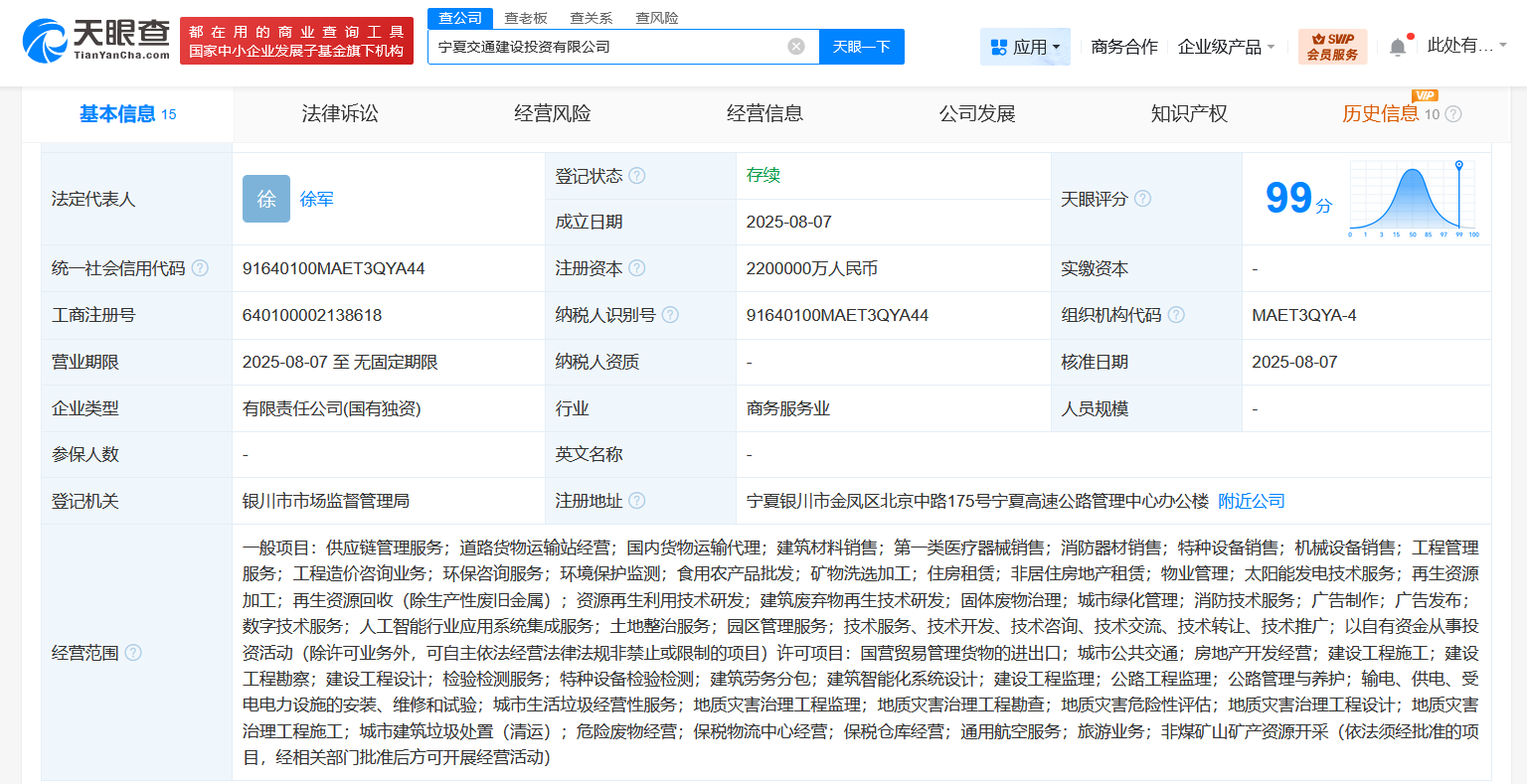 天眼查App显示,近日,宁夏交通建设投资有限公司成立,法定代表人为徐军,注册资本220亿人民币,经营范围含供应链管理服务、道路货物运输站经营、国内货物运输代理、建筑材料销售、工程管理服务、工程造价咨询业务、环境保护监测、太阳能发电技术服务、再生资源加工等。股东信息显示,该公司由宁夏回族自治区人民政府国有资产监督管理委员会全资持股。