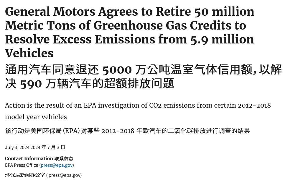 美国环保署(EPA)昨日(7 月 3 日)发布公告,通用汽车公司为解决其汽车二氧化碳排放超标问题,已同意退还约 5000 万吨温室气体信用额度。