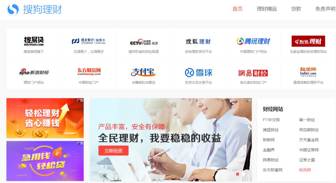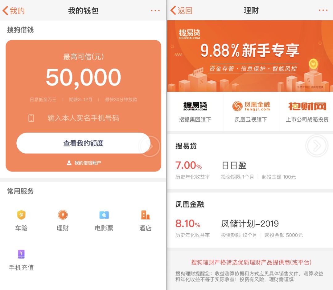 热衷于导流,搜狗做的风生水起。当前,搜狗开设了搜狗金融与搜狗理财,以及搜狗输入法的“钱包”指向的搜狗借钱。根据用户协议,搜狗借钱的小额贷款服务由搜狗旗下搜狗(汕头)互联网小贷公司或平台合作方提供。