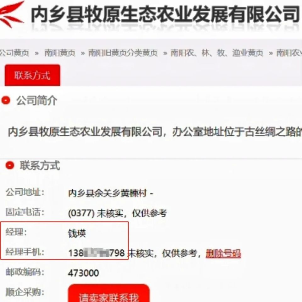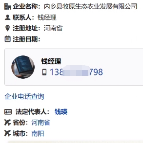 牧原股份实控人钱瑛的号码来源则比较特殊,显示为门户网站,“全网最早出现时间”为2018年9月。点击钱瑛号码的来源链接,网页分别跳转至顺企网、利酷搜黄页网、搜了网、找找去网,这些网站完整展示了钱瑛的电话号码,与探客查显示一致。上述网站将该电话号码关联在内乡县牧原生态农业发展有限公司名下,但记者发现,实际上该企业已变更名称为内乡县牧原科技有限公司。