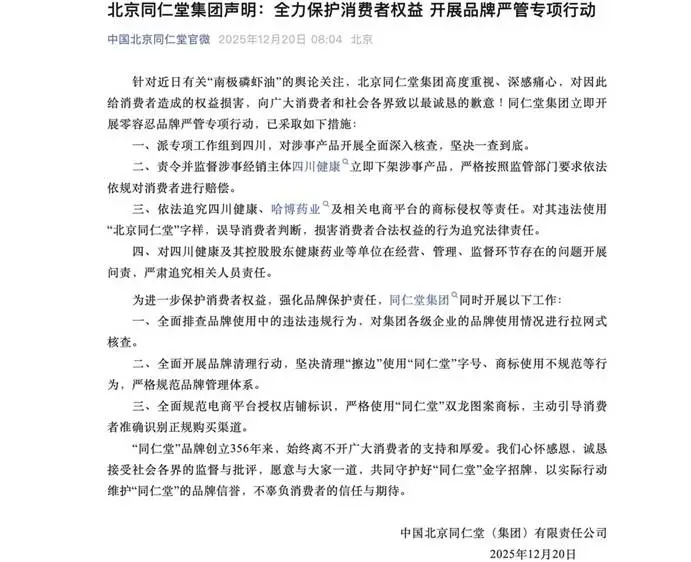事发后,舆论哗然。面对汹涌质疑,同仁堂集团回应称已立即开展零容忍品牌严管专项行动,并将对集团各级企业的品牌使用情况进行拉网式核查,开展品牌清理行动,涉事产品也已责令下架。