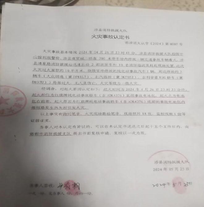 二次自燃后的火灾事故认定书(受访者供图)