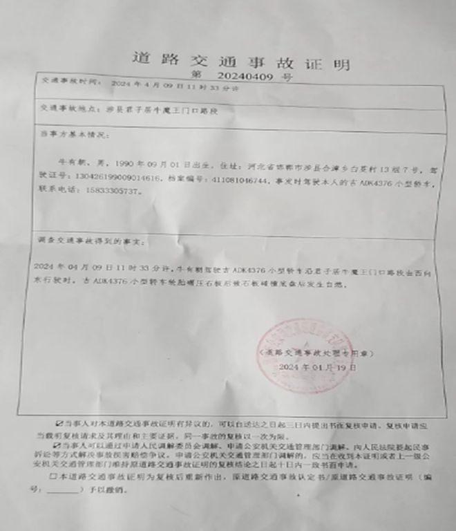 在邯郸市公安局交通巡逻警察支队涉县大队4月19日出具的第20240409号道路交通事故证明中关于<调查交通事故得到的事实>一栏中显示:“2024年4月09日11时33分许,牛某驾驶吉ADK4376小型汽车沿君子居牛魔王门口路段由西向东行驶时,吉ADK4376小型轿车轮胎碾压石板后致石板碰撞底盘后发生自燃”。