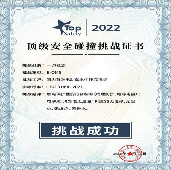 此次试验还得到了国内首次电动车托底挑战的顶级安全碰撞挑战证书。