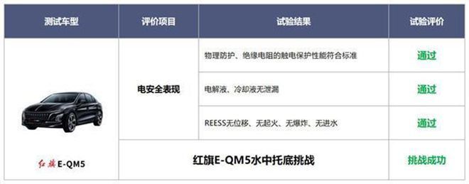值得注意的是,牛先生所购买的红旗E-QM5轿车此前曾在中国汽车技术研究中心有限公司实车碰撞实验室进行过一次“双托底加涉水”测试,整个实验模拟了日常行驶路况,过程是接受挑战的红旗E-QM5先是以20km/h的速度与路面避障发生底部碰撞后,整车底盘进入300mm深在水坑中,再次与水下避障发生碰撞,避障与电池包重叠为25mm。就是在这种情况下,车辆仍可以安全的驶出水坑,挑战成功。