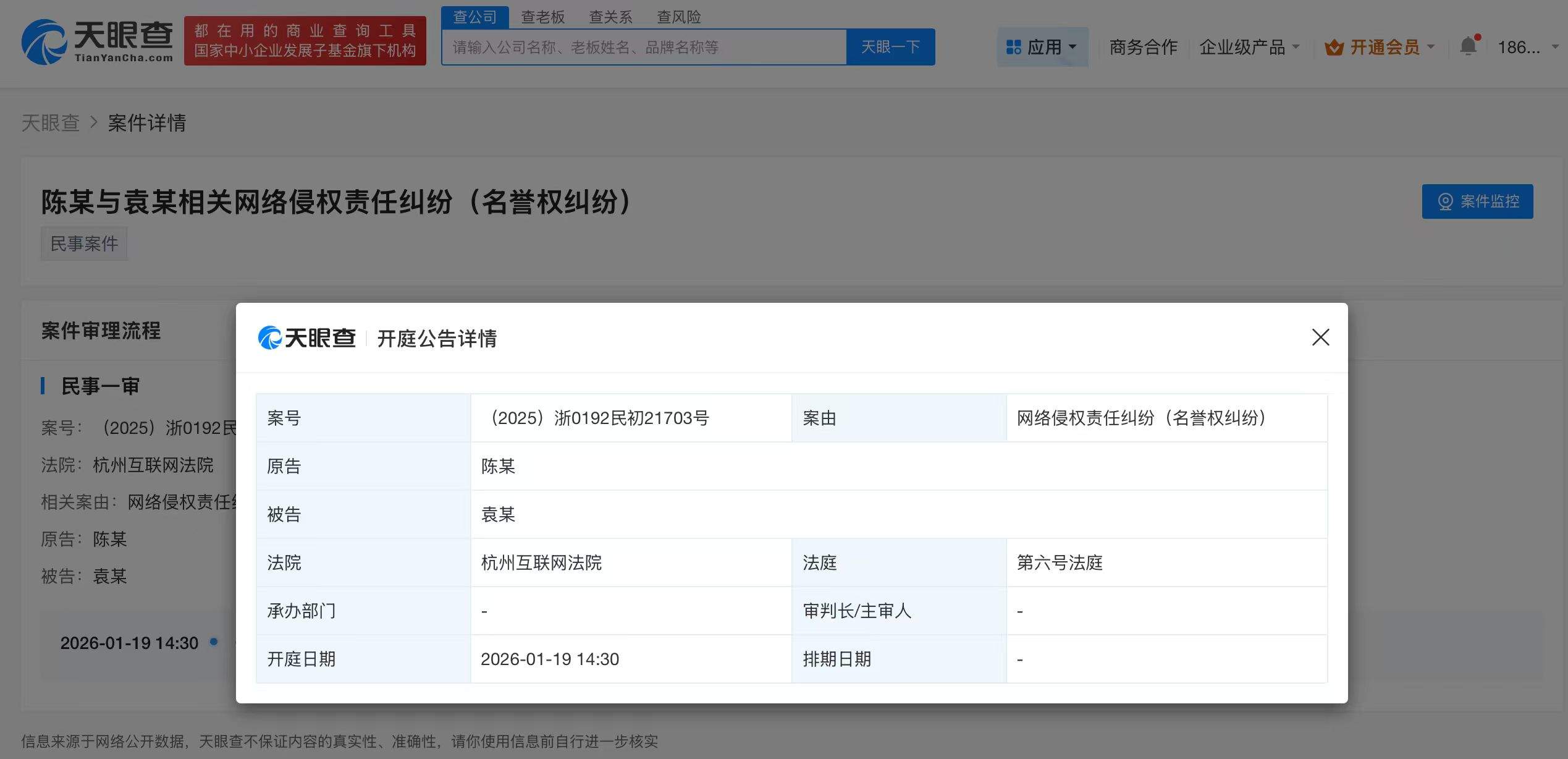 天眼查天眼风险信息显示,近日,陈丽君分别与林某、袁某新增开庭公告,原告为陈丽君,案由均为网络侵权责任纠纷,上述两案件将分别于2026年1月14日、2026年1月19日在杭州互联网法院开庭审理。