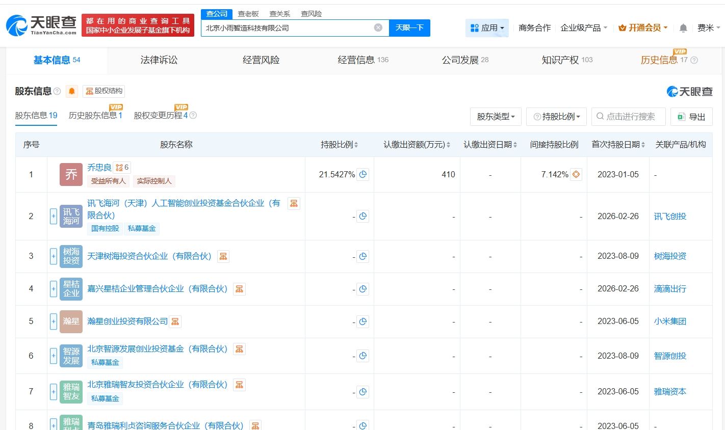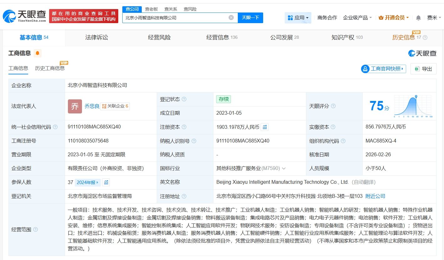 天眼查App显示,近日,北京小雨智造科技有限公司发生工商变更,新增茅台(贵州)高质量成长股权投资合伙企业(有限合伙)、福建省招赢数字股权投资基金合伙企业(有限合伙)等为股东,同时注册资本由约1714.6万人民币增至约1903.2万人民币。