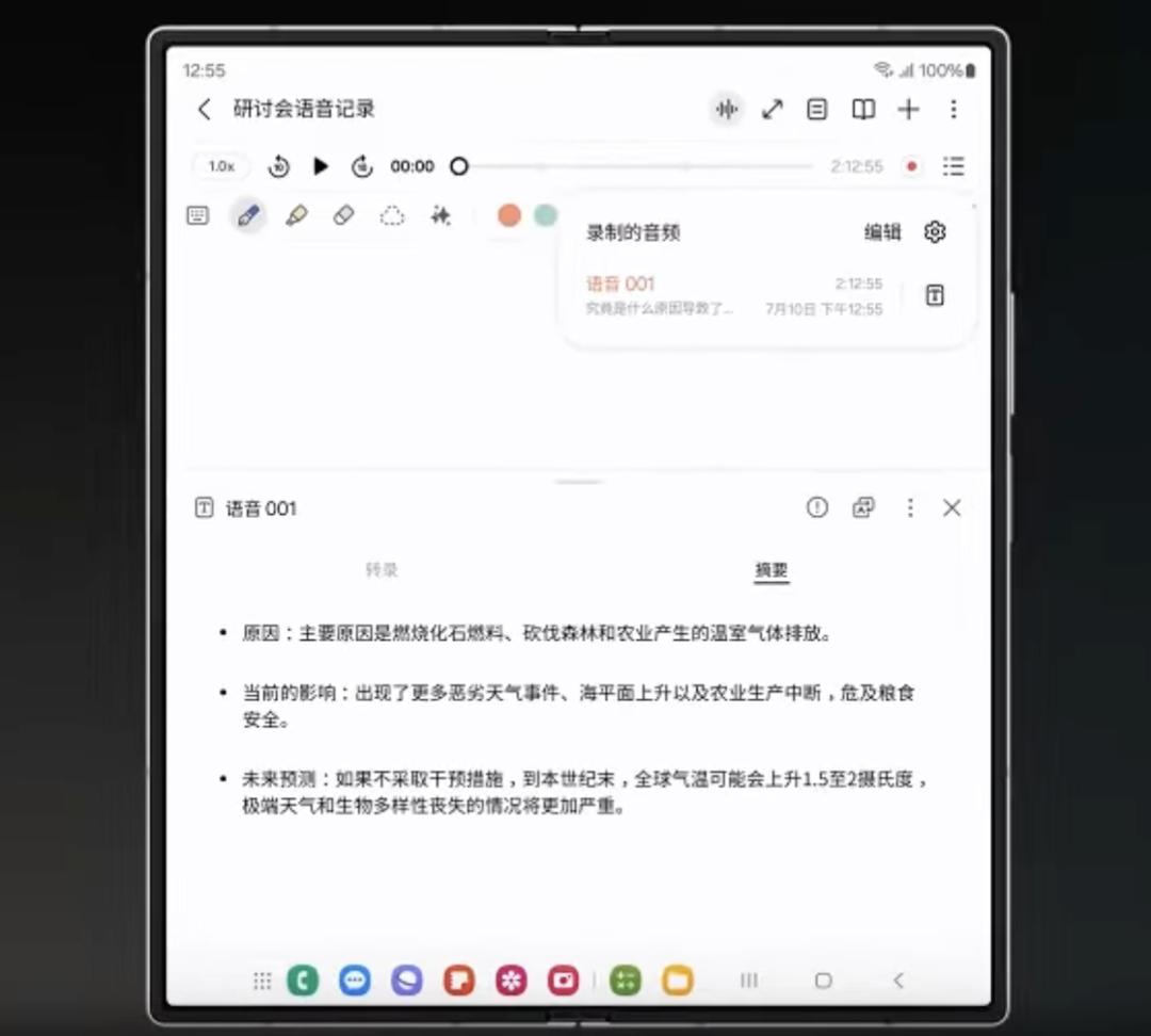 诸如转录助手、PDF翻译、即圈即搜等AI功能搭载至Galaxy Z Fold6,带给用户的不仅是新奇的体验,亦是效率救星——试想一下,当过去需要用与会议同样时长的时间来进行会议文字记录整理、要点归纳的一个会议总结,现在借助转录助手,用户仅用轻点几下就可完成同样的工作,这是何种的效率提升?