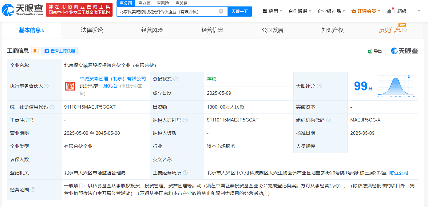 天眼查App显示,近日,北京保实诚源股权投资合伙企业(有限合伙)成立,执行事务合伙人为中诚资本管理(北京)有限公司,出资额130.01亿人民币,经营范围包括以私募基金从事股权投资、投资管理、资产管理等活动。