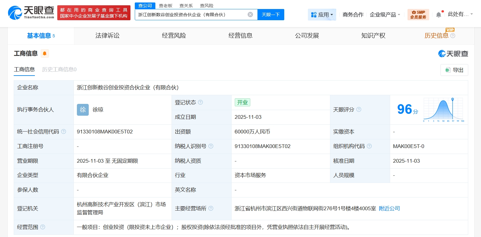 天眼查工商信息显示,近日,浙江创新数谷创业投资合伙企业(有限合伙)成立,执行事务合伙人为徐琼,出资额6亿人民币,经营范围为创业投资、股权投资。合伙人信息显示,该合伙企业由杭州高新创业投资有限公司、浙江金蚂股权投资管理有限公司、浙江省创新数字发展有限公司、蚂蚁集团旗下云涌产业共赢(北京)创业投资有限公司等共同出资。