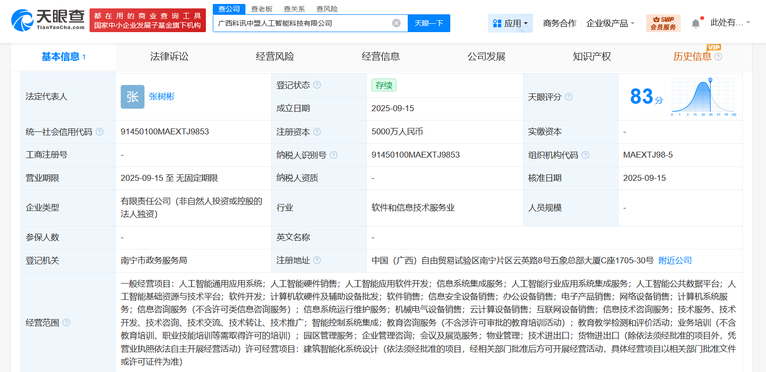 天眼查工商信息显示,近日,广西科讯中盟人工智能科技有限公司成立,法定代表人为张树彬,注册资本5000万人民币,经营范围含人工智能通用应用系统、人工智能硬件销售、人工智能应用软件开发、信息系统集成服务、人工智能行业应用系统集成服务、人工智能公共数据平台、人工智能基础资源与技术平台、软件开发、计算机软硬件及辅助设备批发等。