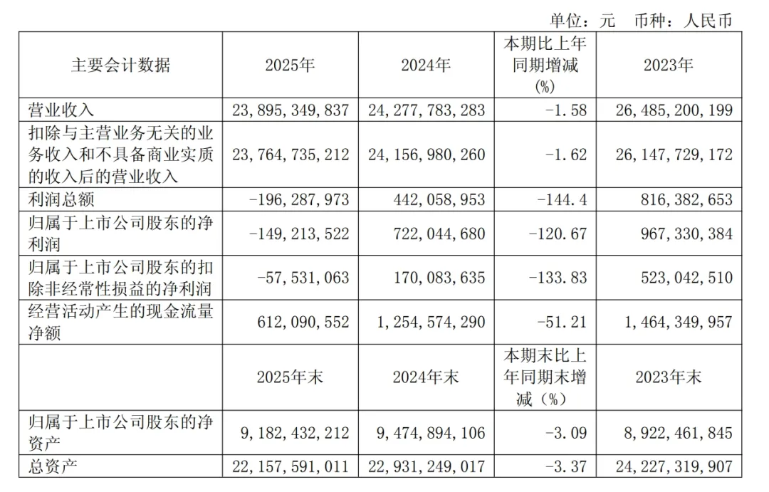 近两年来,光明乳业业绩一直在走下坡路,2025年公司净利润更是由盈转亏。2023年到2025年,光明乳业营收分别为264.9亿元、242.8亿元、238.95亿元,分别同比下滑6.13%、8.33%、1.58%;同期净利润分别为9.67亿元、7.22亿元,-1.49亿元,分别同比增长168.19%、-25.36%、-120.67%。