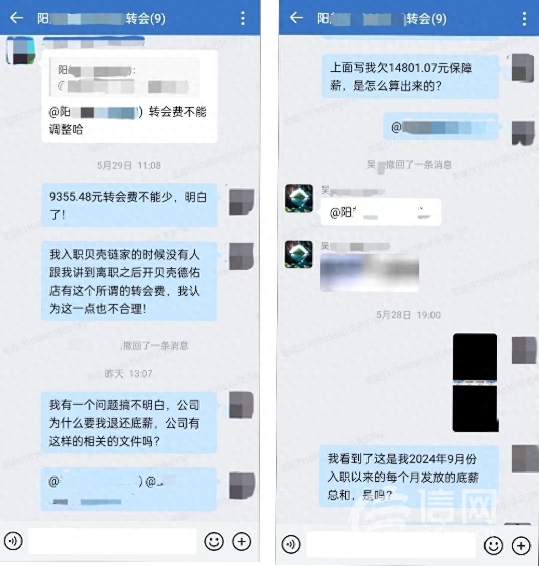 从阳先生提供的与链家和深圳聚成人力资源公司相关工作人员的聊天记录中信网发现,阳先生多次尝试追问“借薪制”的制度依据、转会费的协商流程及标准等问题,工作人员回应称,“保障薪”实际为“责任薪”,转会费需转出转入方店东协商,按公司内部建议标准进行核算,这些对规则细节的解释并未能让阳先生信服。这种先用底薪预支再以提成抵扣的模式,被阳先生质疑实为变相无底薪用工,阳先生指出,相关规定均未在合同中体现。“这个转会费让我觉得自己好像突然变成了足球明星,都要出转会费。”