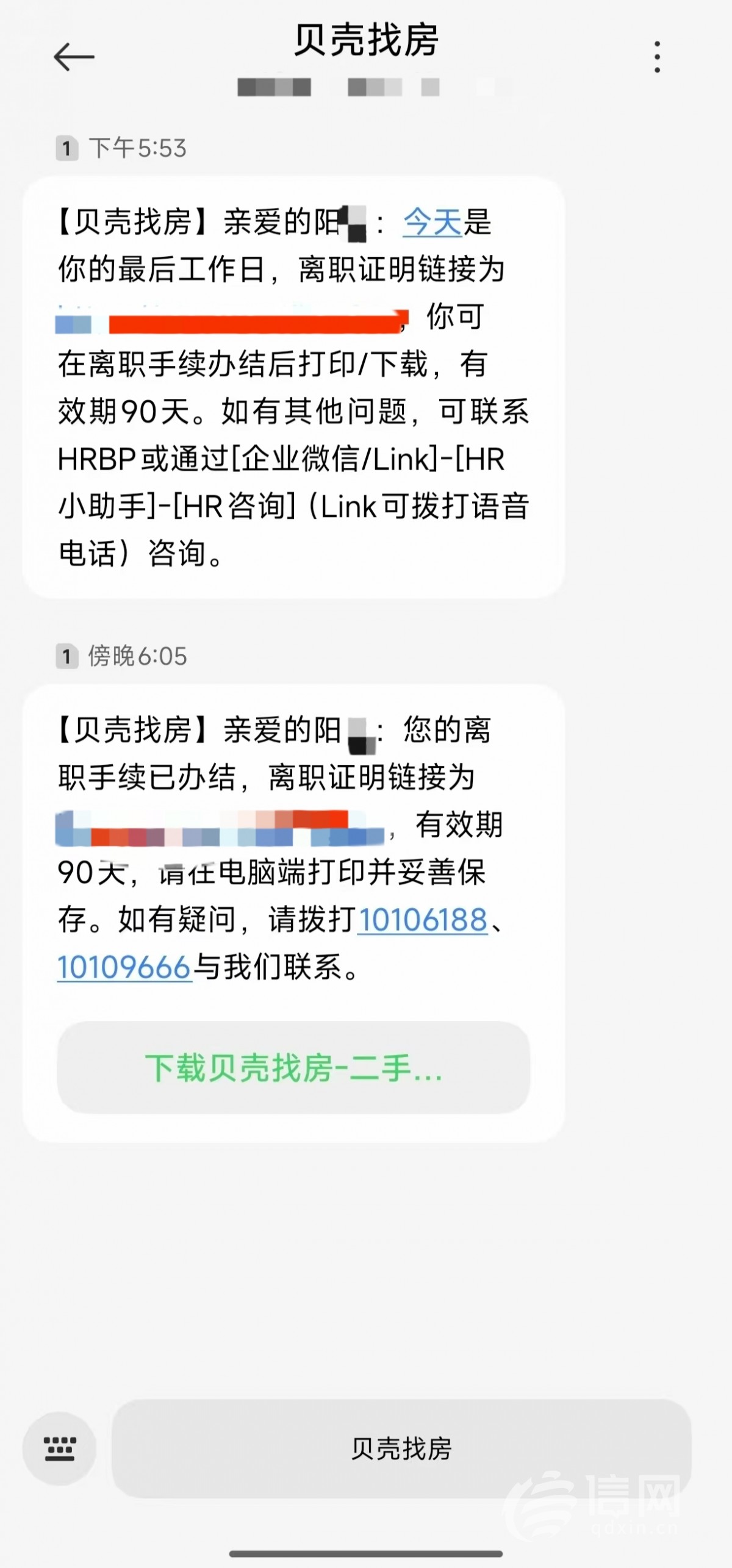 阳先生被解聘并办理完离职手续短信截图。(来源:受访者)