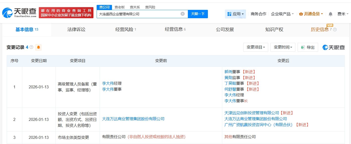 天眼查工商信息显示,近日,大连盛西企业管理有限公司发生工商变更,新增大家人寿保险旗下天津远见创新投资管理有限公司、广州国资旗下广州广资航赢投资咨询中心(有限合伙)为股东,同时,多位主要人员发生变更。