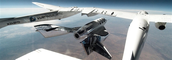一架双体“母舰”飞机带着宇宙飞船飞往海拔近10英里的高空,随后将飞船释放。飞行员立即启动了SpaceShipTwo的发动机,向太空飞行,在大约两分钟的时间里再次上升了45英里。