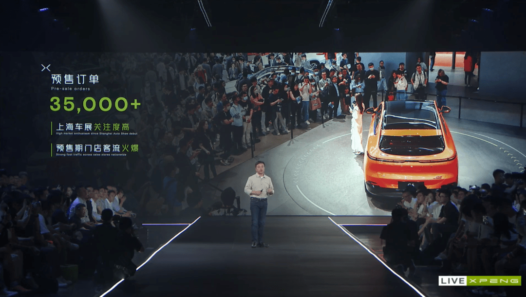 我们先看发布会。说车之前,何小鹏先炫耀了一下 G6 预售以后收到的 盲订订单。三万五千单,甚至比他们今年第二季度卖的车还多。。。