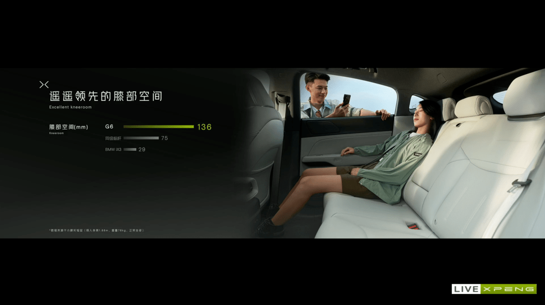 讲到后排的时候,何小鹏表示 G6 的腿部空间和乘坐体验,都能 远超 “ 同级标杆 ” 。