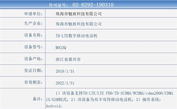 【TechWeb】近日魅族的一款型号为M923Q的新设备入网了工信部网站,此次入网工信部申请单位为珠海市魅族科技有限公司,设备的名称为TD-LTE数字移动电话机。结合此前爆料的信息,这款新机就是魅族即将发的Note 9手机。