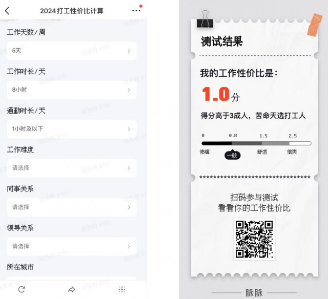 区别于此前网络流传的工作性价比计算方式,脉脉工作性价比计算器除了日薪、工作环境、工作时长、学历等基础维度之外,注重职场工作体验,增加了每周工作天数、通勤时长、工作难度、领导关系等影响职场人工作体验的重要维度。用户只需要一次填写,就可以测出自己的工作性价比。