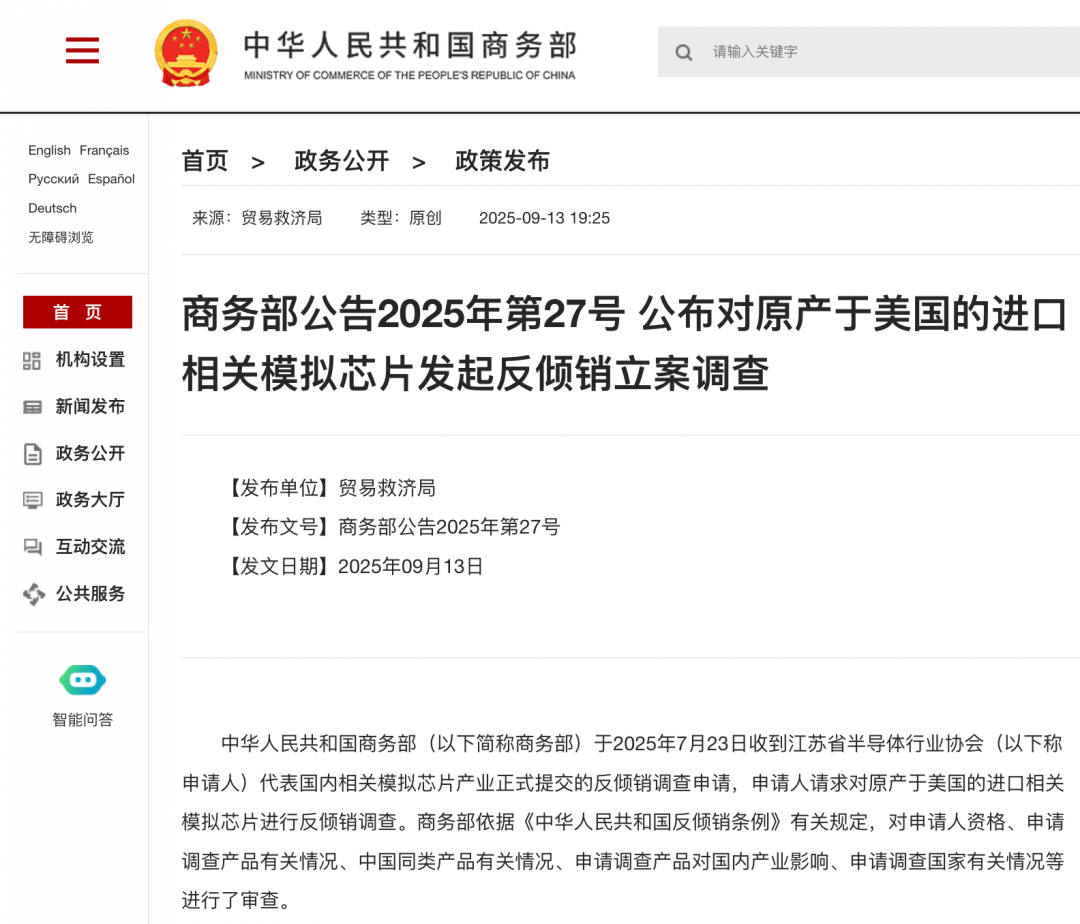 商务部发布 2025 年第 27 号公告,对原产于美国的进口相关模拟芯片发起反倾销立案调查。