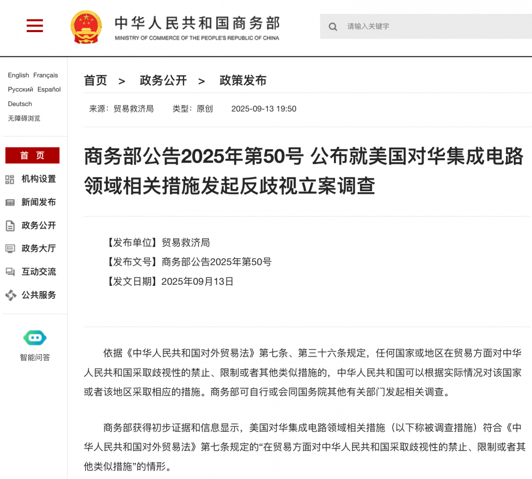 商务部发布2025 年第 50 号公告,就美国对华集成电路领域相关措施发起反歧视立案调查。