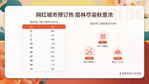 从木鸟民宿预测数据来看,2021年国庆热门预订城市TOP10分别为:重庆、长沙、成都、上海、西安、青岛、杭州、武汉、广州、南京。上述热门城市,新晋网红城市重庆、长沙、成都、西安占据四席,且排名在前五。