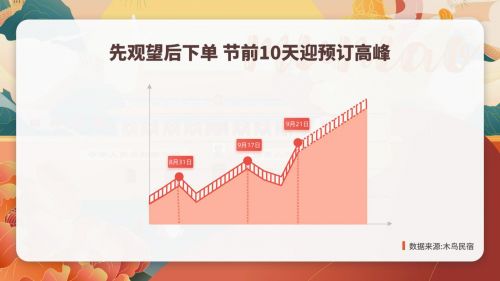 另外。从木鸟民宿2021年国庆订单增长走势来看,8月31日迎来第一个预订高峰,部分用户选择节前一个月提前预订,保证在房源位置、房型、装修等偏好上,有更多选择的空间。随着国庆火车票开始预售,9月17日,木鸟平台迎来第二个国庆预订高峰,抢到车票,订好住宿,国庆旅游准备工作完成一半。中秋刚过,不少持观望态度的用户纷纷下单,利用中秋假期做好十一出行的路线和计划,完成民宿预订,9月21日,平台迎来第三个预订高峰。从三个高峰的走势来看,节前10天为集中预订高峰。