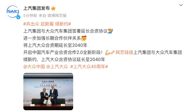 上汽与大众完成续约 上汽大众合资延长至2040年快讯