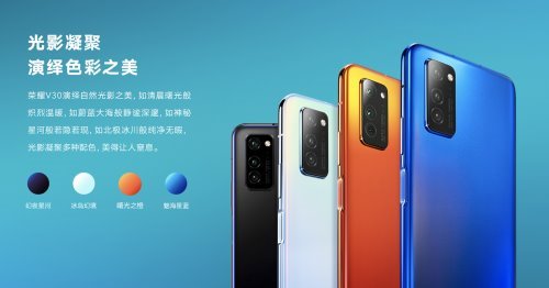 荣耀V30系列采用6.57英寸双摄魅眼屏,屏幕分辨率2400×1080像素,屏占比达到91.46%,并提供冰岛幻境、幻夜星河、魅海星蓝、曙光之橙等多种配色。同时在V系列中首次加入了侧面指纹按键,与电源键合二为一,真正实现了“零感”解锁,一触直达。背面材质上,首次在V系列上引入了AG磨砂的工艺,在保证玻璃的视觉通透感的同时并提升整体背部的触感,能做到防滑、防划伤、抗指纹的效果,让每一次触摸更细腻。