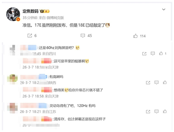 iPhone 17e因60Hz屏遭吐槽,用户担忧18e重蹈覆辙快讯