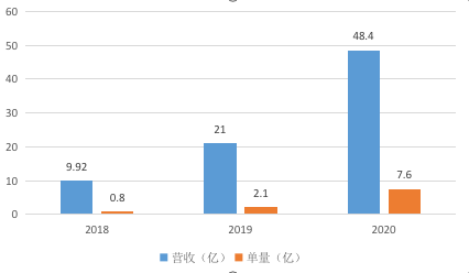 从招股书公开的数据来看,顺丰同城近几年营收规模不断扩大,2018年到2020年,三年时间,营收从9.92亿元增加至21亿元,并在2021年继续扩大至48.4亿元,年营收增速达到了126%和129%。订单方面也是一样节节高升,近三年分别为7980万笔、2.111亿笔以及7.609亿笔。