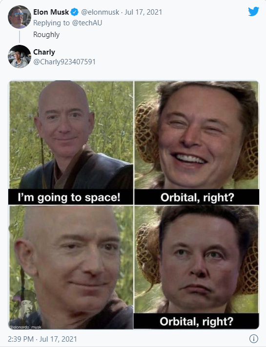 马斯克在推特上发布了一个关于贝索斯飞行的表情包,并评论道“哈哈”。 这个表情包展示了贝索斯和马斯克谈论他的飞行,但是他们的脸被叠加到《星球大战前传2:克隆人的进攻》("Star Wars: Episode II – Attack Of The Clones")中的阿纳金·天行者(Anakin Skywalker)和帕德梅(Padme)身上——这是一款流行的表情包格式。