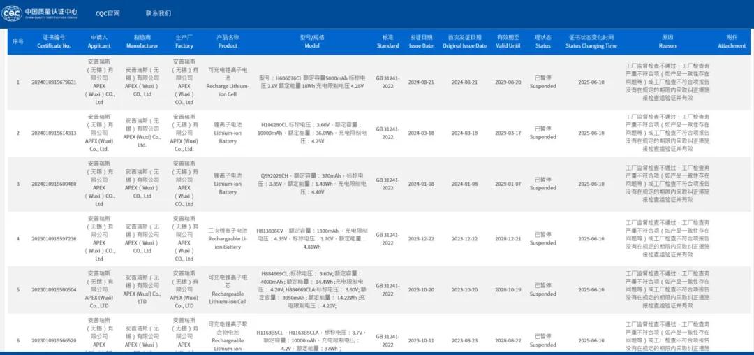 与安克创新、罗马仕、倍思类似,安普瑞斯的多个相关电池及电芯产品3C认证证书也被暂停。