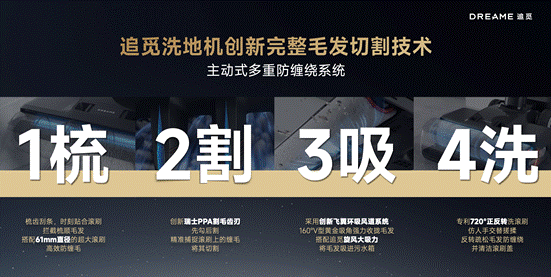 为了彻底解决洗地机缠毛痛点,追觅科技在洗地机新品上搭载了追觅首创主动式0缠毛系统,通过恒压梳齿搭配追觅首创瑞士PPA割毛齿刃技术,梳齿实时贴合滚刷,深入根部梳理毛发,割毛齿刃将缠绕在滚刷上的毛发勾起并割断,真正实现清洁0缠绕,即使长达50cm的头发也能轻松吸入。