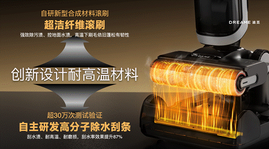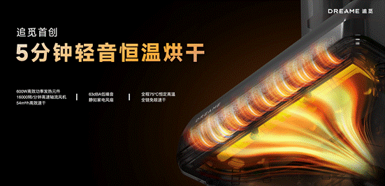作为行业率先将烘干技术带入洗地机品类的品牌,本次发布会上追觅还升级推出了追觅首创5分钟轻音恒温烘干技术,采用600W高效功率发热元件,搭配16000转/分钟高速轴流风机,风量可以达到54m³/h,通过75°C热流除菌,实现滚刷5分钟高效蓬松速干,预防霉菌滋生,即使是梅雨季节,也能干爽如初。