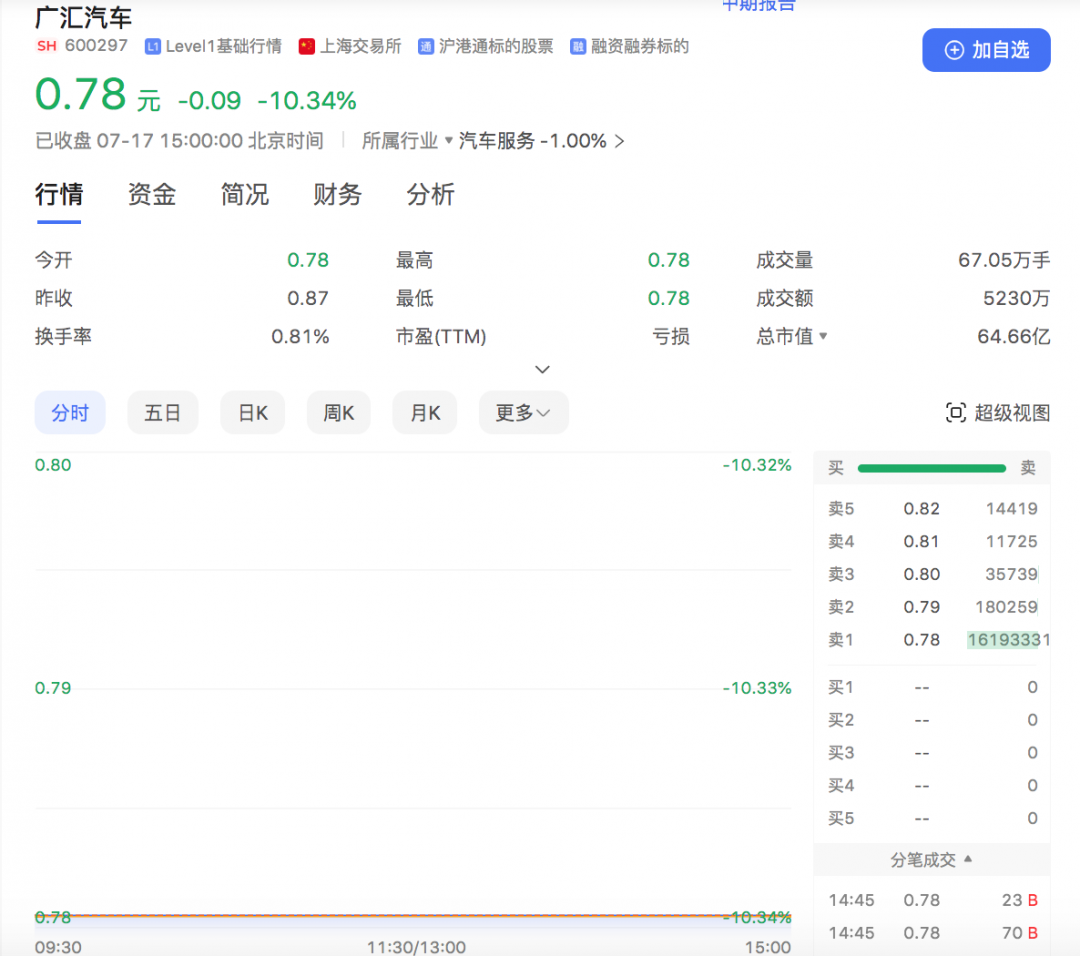 7月17日开盘,广汇汽车一字跌停,封单价0.78元/股,总市值64.66亿元。这家昔日国内最大汽车经销商集团连续20个交易日低于1元,即将触发面值退市条款。