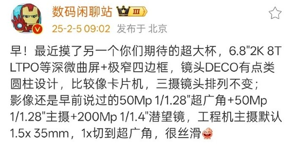 据知名数码博主@数码闲聊站 最新发布的一款超大杯旗舰的部分信息显示,该机将配备6.8英寸的2K 8T LTPO等深微曲屏,边框极窄,镜头模组设计类似圆柱体,风格接近卡片机,三摄镜头排列维持不变。搭载了50Mp 1/1.28"超广角镜头、50Mp 1/1.28"主摄以及200Mp 1/1.4"潜望式长焦镜头。工程机的主摄默认焦距为1.5x35mm,切换至1x时会启用超广角镜头,这一切换过程非常流畅。结合此前相关爆料,这款新机很可能是vivo X200 Ultra。