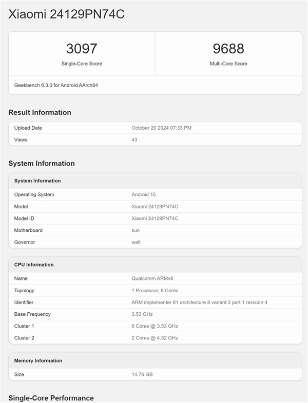据数码博主最新发布的信息显示,近日一款型号为24129PN74C的小米新机现身Geekbench跑分网站,结合此前相关爆料,该机基本可以确认就是即将与大家见面的全新小米15系列的标准版机型。该机将首发搭载骁龙8至尊版平台,这是小米最强悍的数字旗舰。而从Geekbench平台显示的数据来看,其单核成绩是3097,多核成绩是9688。对比苹果的A18 Pro芯片,该机的单核性能跟前者持平,多核性能则完胜苹果。