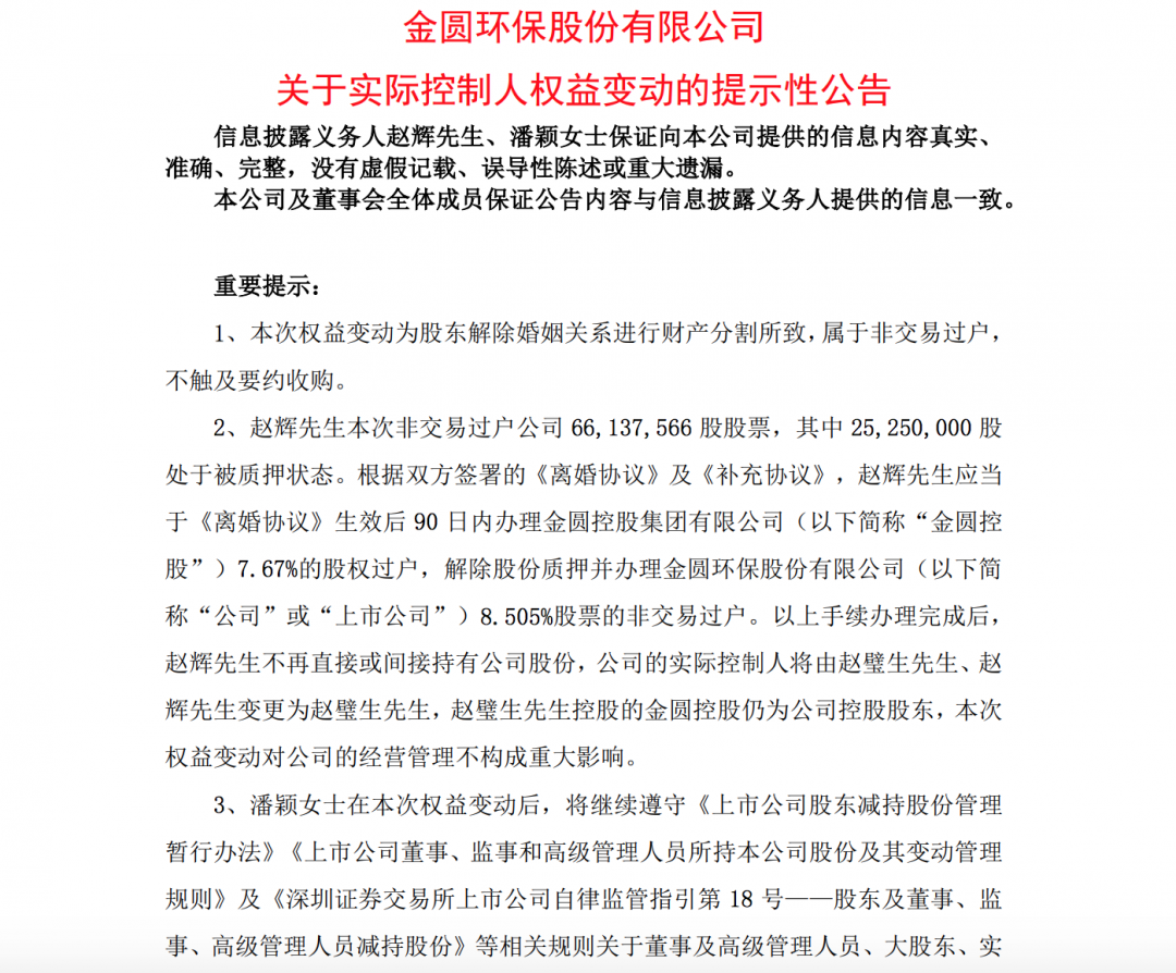3月21日,金圆股份公告,公司实际控制人之一赵辉与潘颖已通过协议离婚方式办理解除婚姻关系手续。按照两人约定,女方潘颖将得到赵辉的全部持股,对应市值约4.1亿元。