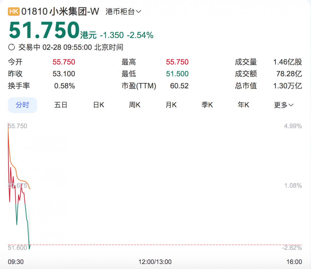 今日开盘,小米集团股价涨4.99%,报55.75港元,随后开始下跌。截至发稿,小米股价下跌2.54%,报51.75港元,总市值1.3万亿港元。