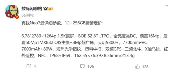 据知名数码博主@数码闲聊站 最新发布的信息显示,与此前曝光的消息基本一致,全新的真我Neo7将采用一块6.78英寸1.5K直屏,支持京东方S2 8T LTPO技术,支持全亮度类DC调光。将搭载联发科天玑9300+芯片,配备了7700m㎡单体VC散热材料。前置1600万像素自拍镜头,后置5000万主摄+800万超广角的双摄相机模组。此外,该机的电池是7000mAh,支持80W有线闪充,支持IP68+IP69满级防尘防水,拥有X轴马达、红外遥控、NFC等功能,厚度是8.56mm,重量是213.4g。